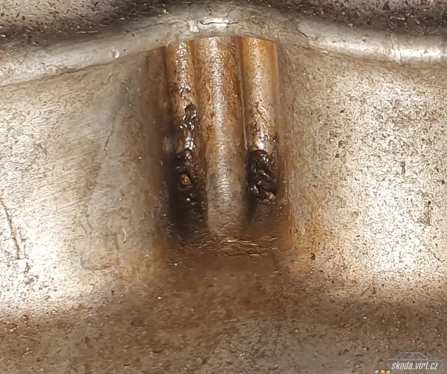 Na fotce je vidět mastná čárka přes žebírko v prohlubni bloku - prasklinkou vyvzlínaný olej krátce po odmaštění benzinem: