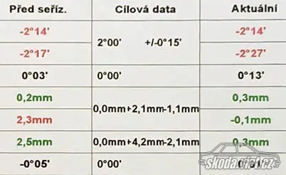 -> minno: Bol som v servise. Viď protokol po nastavení geometrie. O rok neskôr som nabehol na obrubník a musel dať prednú nápravu nastaviť znova. Ale z toho nemám protokol. Viem iba toľko, že so zadkom nerobili nič a predok nastavili. Nemali k tou žiadne ďalšie pripomienky. Medzitým som skúšal vymeniť gumy medzi šikmým a pozdĺžnym ramenom, lebo mi to robilo to, čo som opísal v pôvodnom príspevku. Možno som rozhodil geometriu zadnej nápravy, to teraz už neviem.