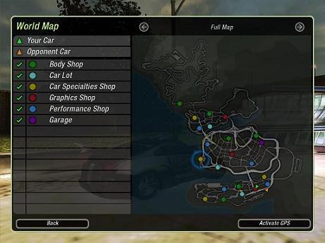 pokuď chcete vědět, kolik jich máte nalezeno, stačí dat t a tam je soupis všek obchodů, jinak zelený kolečko je tunníng karosérie, zlatý neony,muzika,světla a další specialitky, červený je lakovna, tmavě modrý tuning motoru,převodovky... a světle modrý je obchod s autama. Nejlepší je najít všechny šopy, protože pak se vám otevřou další možnosti tuňení. Taky je potřeba mít, co nejvíc hvězdiček, aby se otevřely další zavody, Otevření další části města závisí taky na zajetí všech U.R.L závodů (žlutý kolečko).