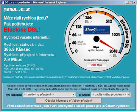 -> Samantus: no ja mam chello plus to je mam dojem az 4096kb/512kb ale tech 3500kb/s je prumer:)aůe stejne stahuju tou megarychlosti jen ze serveru renomovanych firem na kazaa si muzu nechat zdat byt jen o 100kb/s a dc++ tak max 150...