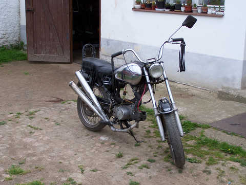 Tatikova jednovalcova CZ 250 sport. V teto uprave jsme ji koupili za 3.5t, pak prosla kompletni renovaci. Puvodne jsme uvazovali o vymene blatniku, svetla a vyfuku za origianal (mame je na pude), ale takhle je to vetsi raritka a z toho vyfuku litaj krasny kourovy kolecka :-)