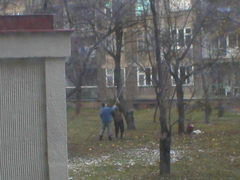 náhodou jsem teď vykouknul z okna a tohle stojí za to- nějakcí dva důchodci tam s 5ti metrovým klackem sklepávaly zmrzlý jablka který ještě neztačily spadnout. Holt šetřej kde se dá.