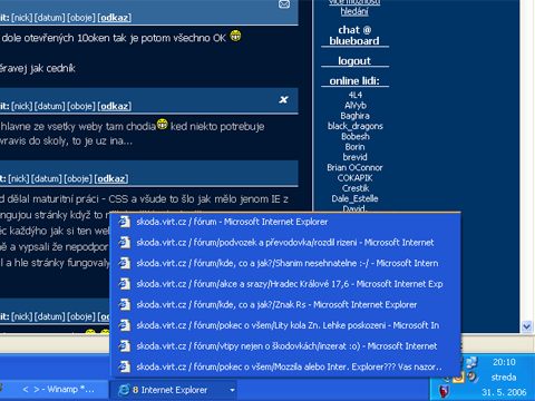 -> minno: Jenze to je dalsi kliknuti navic - nejdriv na panel IE a pak musis jeste najet na prislusny okno - a cim vic si zvykam na operu, tim vic jsem nasranej, kdyz najdi stranku, ktera je jen pro IE (jaky paradox - vsechny prohlizece by mely byt zalozeny na jednom schvalenem standardu) a musim pustit tu vec a muzu se uklikat - dyt jenom history.back(-1) je v IE strasne dlouhej pohyb pres nejmin pul obrazovky a jeste klik...