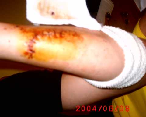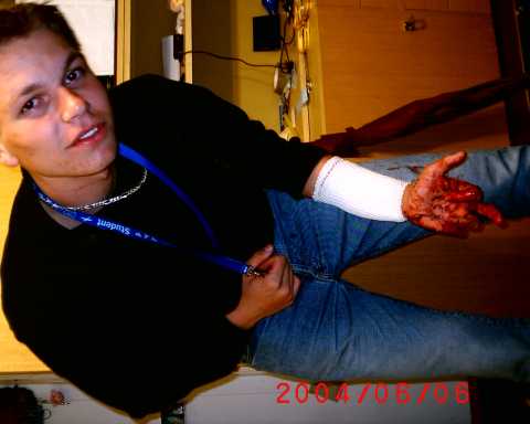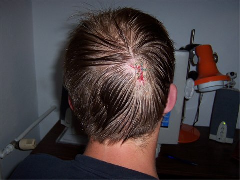 povrchove poranenia (do 5mm) zasijes obycajnym stehom, zatiahnes na dva uzliky a odstrihnes, ked to takto spravis kazde 3mm, bude to fajne....pokial pritom neodpadnes, po zasiti musis ranu postriekat antiseptikom (zlte jodove sracky s liehom, nechat oschnut a zafacovat),
