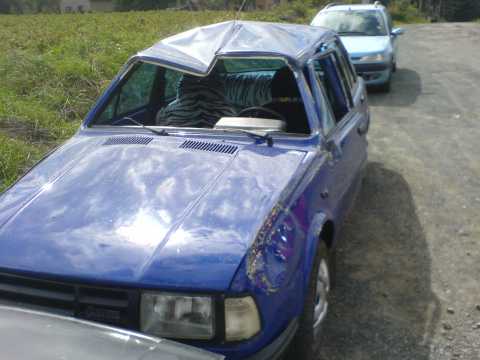 Tak pridam fotku kamosovho fiata pre vystrahu.Bol opity a isiel cez zimu na diskoteku ci kam.Isiel asi 60 a v zakrute dostal smyk.Na kazdej strane vozovky bol namrznuty zavej.Vyletel na jeden zavej a myslel si ze tam ho to zastavi,ale ono ho to odrazilo na opacnu stranu na ted druhy zavej a ten ho tiez samozrejme nezastavil ale ho preletel.Smola bola ze tam bol svah asi 4m a tam potok.Samozrejme ze nemal pas a spolujazdec tiez nie takze im to otrieskalo hlavy.Inak ziadne zranenia.Ale vraj nebolo moc prijemne vyliezat z auta do potoka pri teplote -10