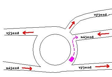 Jinak mě se stalo taky něco velmi příjemného. Jeli jsme s instruktorem já a jedna blondýna. Jiřík seděl vzadu a řídila slečna. Aj trojku jsme za jazdy dali. Mno a tak přijíždíme v Plzni na jeden veliký kruhový objezd (zdejší vědí) a tam kde je na obrázku fialové autíčko, tak instruktor opakovaně upozornil, že se bude sjíždět na dalším sjezdu z kruháče. Slečna sice sjela, ale do nájezdu (viz. šipky) a byl věru velmi zajímavý pocit sledovat reakce obézní blondýny, instruktorovu hru nohou na pedálech a štrachání třesoucíma se rukama do řízení a neméně zajímavé reakce vytrubujících a blikajících aut v protisměru.