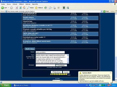 Jde o to že se mi dostal včera do počítače vir.mám několik antivirů.Spybot,Ad aware a Nod32,všichni něco nalezli,samozřejmě buď jsem je smazal nebo se to opravilo.přesně si to nepamatuju.jednalo se o trojského koně.TROJAN atd.jenže teď se mi pořád vpravo dole ukazuje ikonka System alert s červeným otazníkem a říká že system detekoval virus a nevím jak to odstranit.jestli mám vir v počítači nebo ne,testoval jsem to několikrát.přikládám foto