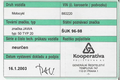 A jelikož vy jako pořádní uličníci by jste mi to nevěřili, tak tady máte oskenovanou pojistku, techničák je v rozkladu, tak ten skenovat nebudu.
