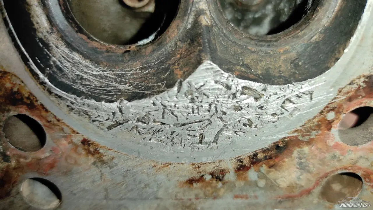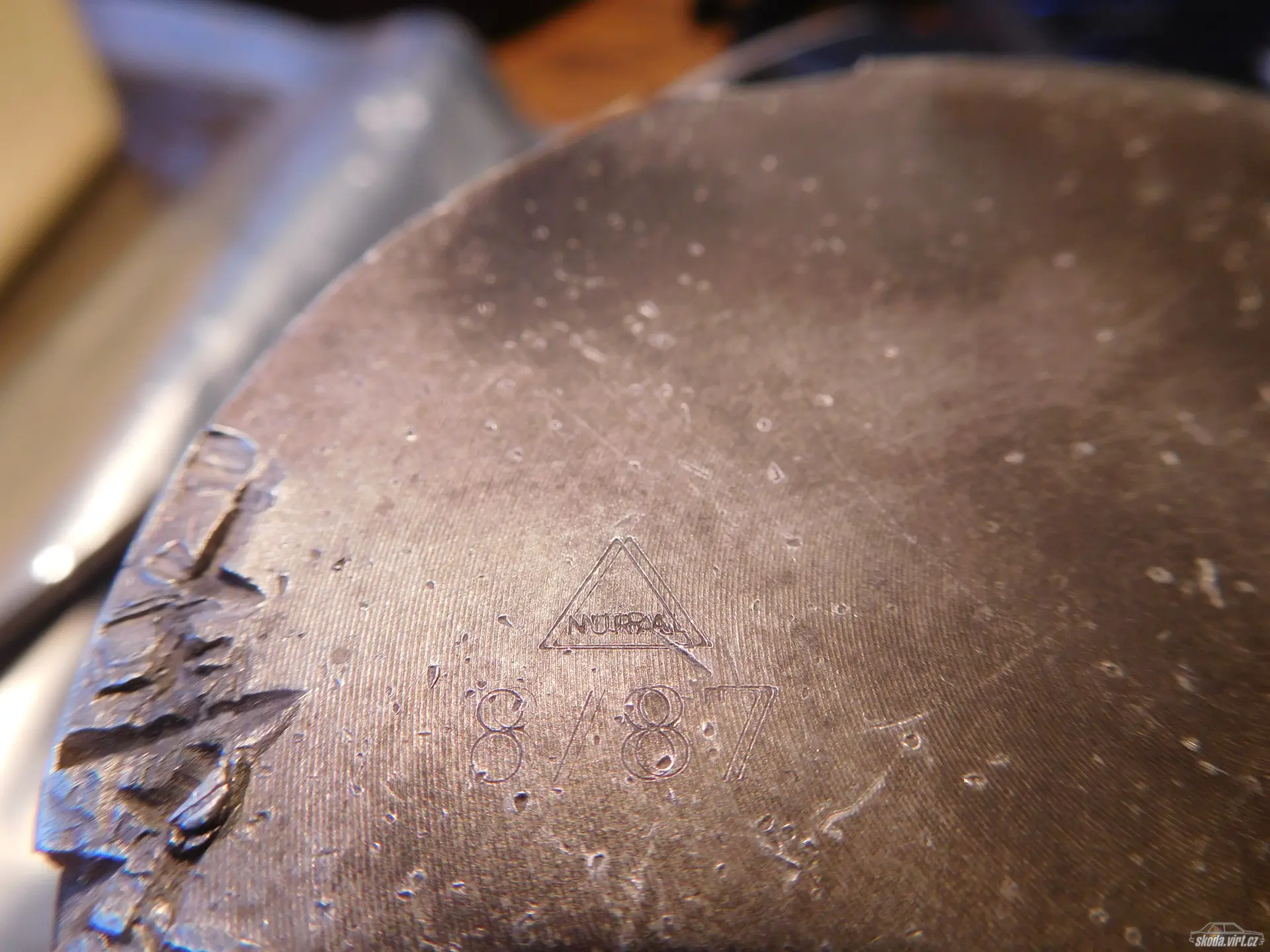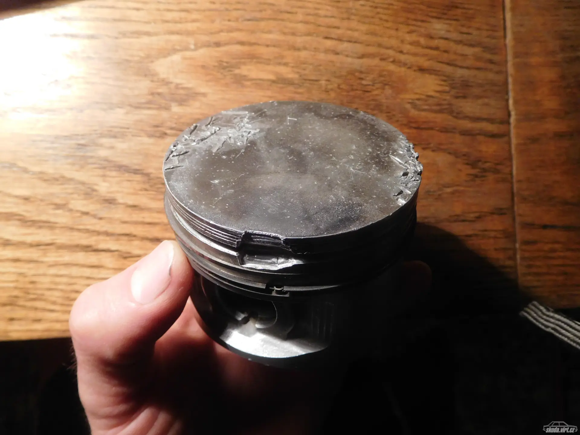 Píst jsem si nechal na památku, protože rozpadlý pístní kroužek si našel cestu skrz píst do spalovacího prostoru přesně ve chvíli, kdy kamarád couval ode mne ze zahrady (někdy kolem roku 2005, auto mělo najeto něco málo přes 100 tisíc). Pak jsme místo původního motoru nahodili 781.135 se sníženou hlavou a vačkou 110R, který jezdil jak splašený a na kterém kamarád za dalších 10 let najezdil dalších 150 tisíc (na LPG)...
