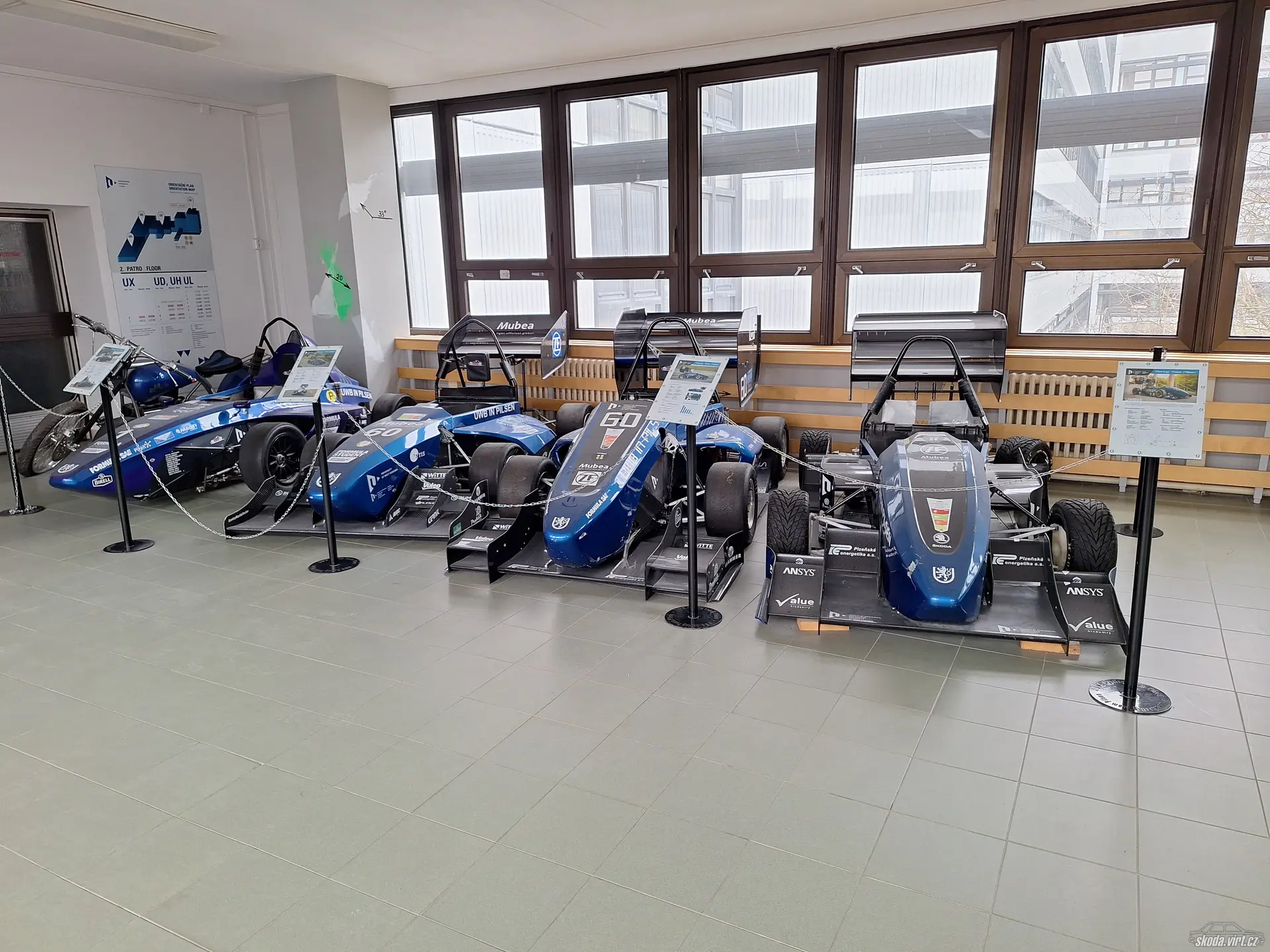Po letech jsem se vyskytl na fakultě. Ve spojovacím mostě jsou vystavené studentské formule